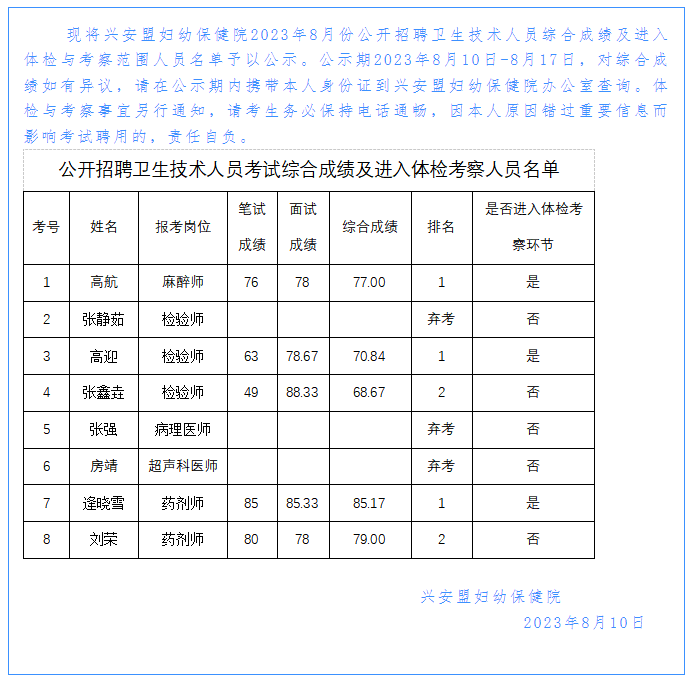 2023年8月份兴安盟妇幼保健院公开招聘卫生技术人员考试综合成绩及进入体检与考察人员名单公示